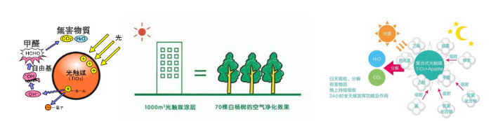 光触媒是目前国际上渐趋流行的一种新型环保材料,其主要成分是纳米级二氧化钛(TiO2).这是一种喷涂于墙面后,可形成一层薄膜,通过吸收阳光中的紫外线发生光催化作用产生活性氧和氢氧自由基,将空气中的甲醛、苯、氨和TVOC(总挥发性有机物)等有害物质降解成水和少量二氧化碳排除,起到净化空气的作用。在反映过程中,光触媒本身不会发生变化和损耗,仅仅起到催化剂的作用,持久耐用。不仅如此,光触媒产品还具有很强的灭菌功能。