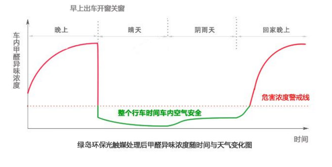 普通光触媒的运作需要有强光照射的环境下才能有效的处理甲醛,一年四季都要有这样的环境是很困难的况且甲醛的挥发期是3-15年。绿岛环保采用锐钛纳米二氧化钛掺和微量贵金属尽心配置而成的光触媒,使得其在微光下也能起到效果,净化效果比普通光触媒大大提升。